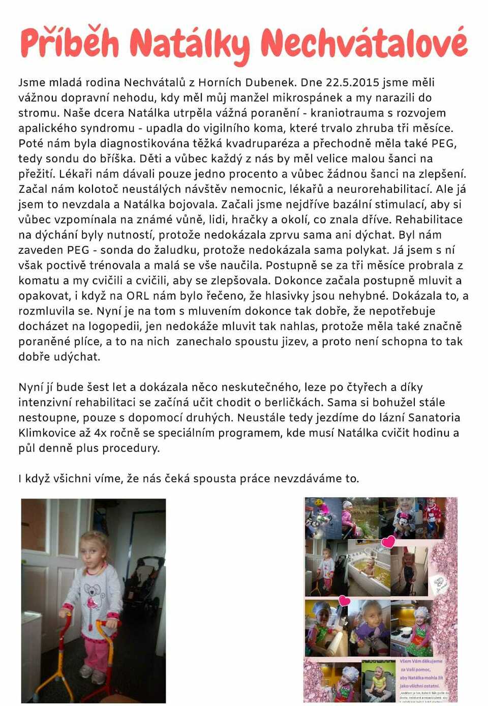 Když byl Natálce necelý rok měli její rodiče vážnou dopravní nehodu. Natálka po této nehodě upadla do vigilního koma, které trvalo asi 3 měsíce. Poté jí byla diagnostikována těžká kvadruparéza a přechodně měla sondu do bříška. Lékaři jí dávali pouze 1% šanci na přežití a žádnou na zlepšení. Zpočátku nedokázala sama ani dýchat, protože měla těžce poraněné plíce. Rehabilitace na dýchání byly tedy nutností. Přestože rodičům Natálky po vyšetření na ORL sdělili, že hlasivky jsou nehybné, začala postupně mluvit a opakovat. Nyní je na tom s mluvením tak dobře, že nepotřebuje docházet na logopedii, jen nedokáže mluvit nahlas, protože na plicích má spoustu jizev a není schopna mluvení udýchat. Díky péči rodiny se po 5 letech Natálka dokáže s pomocí druhých postavit na nohy. Pravidelné rehabilitace ve specializovaných zařízeních jsou pro ni velice důležité. Tyto rehabilitace jsou náročné samozřejmě nejen časově, ale především finančně. Rozhodli jsme se tedy rodičům Natálky v jejich nelehké situaci pomoci.